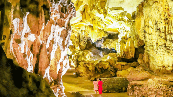 Nestled near the beautiful Bai Tu Long Bay and surrounded by the Bàn Cờ mountain range, Vũng Đục Cave Tourist Area in Cẩm Đông Ward, Cam Pha City, is a must-visit destination during a 3-day-2-night Coto Island tour. This unique tourist area carries significant historical and religious significance, connected by five magnificent and majestic caves: Thiên Đăng Cave, Long Vân Cave, Ngỡ Ngàng Cave, Kim Quy Cave, and Dơi Cave. The caves are adorned with various stalactites and stalagmites, taking on bizarre shapes such as dolphins, swans, elephants, bells, and lotus flowers, allowing visitors to unleash their imagination.