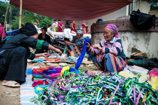 Located at the foot of the majestic Tay Con Linh peak, the Hoang Su Phi Sunday market convenes every week. Here, locals engage in the exchange of goods for their daily needs, including fruits, fabric, and embroidered items. While not overly bustling, the atmosphere is always lively, resembling a festive gathering. Some young men and women even prepare for the market from the night before to make it in time for the lively congregation.