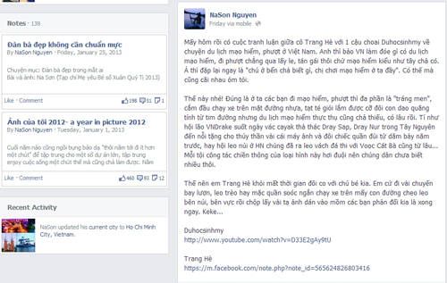 Photographer Na Son - one of those who have undertaken numerous adventurous trips and extreme sports across Vietnam - has also spoken out to Trang Ha: 'Forget about wasting time arguing with that kid. Just take a few flights, climb, wear shorts and ride on those winding mountain roads, beside cliffs, then snap a few photos to shut up those opposing voices,'
