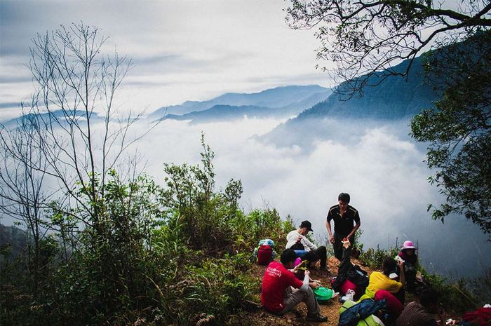 Halfway up, exhaustion sets in, some showing signs of sunstroke even though the sun isn't too harsh. The group decides to take a break at the 3 km milestone for lunch. From here, looking around, you'll see a sea of clouds and mountains. Looking down, the roads just traveled are obscured by the mountainous forest. Looking up, the high road feels daunting, creating a sensation of being suspended between the sky and the ground.
