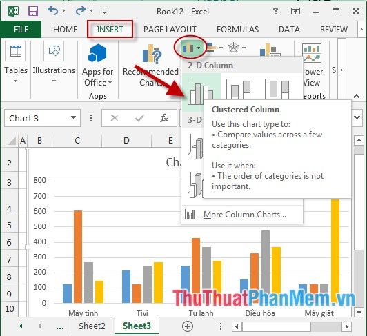 Step 3: Select the data range for creating a statistical chart -> Insert -> go to the Columns -> choose the type of chart to create: