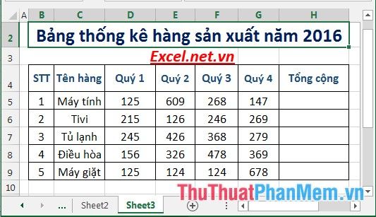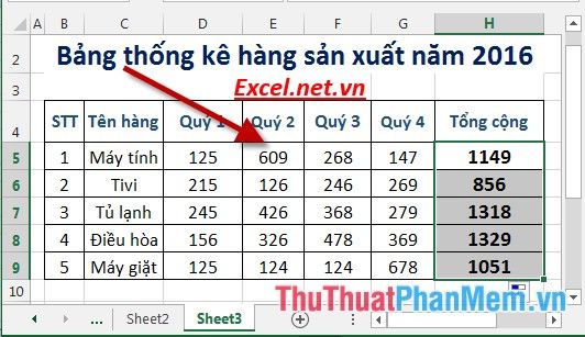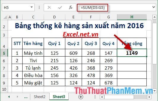 Step 1: Calculate the total quantity of items sold in the year. In the cell for calculation, enter the formula: =SUM(D5:G5) -> press Enter -> the result returned is: