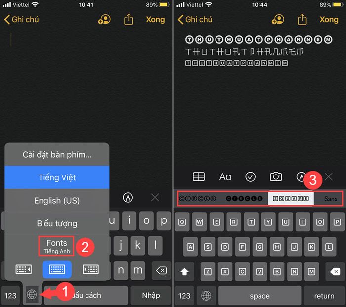 Step 6: After installation, you can start using the new font. While typing, tap the globe icon (1) on the keyboard => select Fonts (2). To switch fonts, tap on the desired font at the top of the keyboard (3).