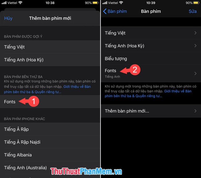 Step 4: Select Fonts (1) to add a new keyboard. Then, click on the Fonts (2) keyboard once again in the keyboard list.
