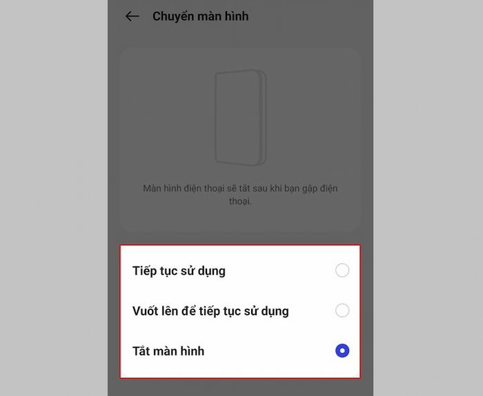 Step 2: Subsequently, the screen interface will appear with 3 options: Continue using, Swipe up to continue using, and Turn off the screen. What you need to do is choose the mode that you find most convenient and easy for performing Screen Switching.
