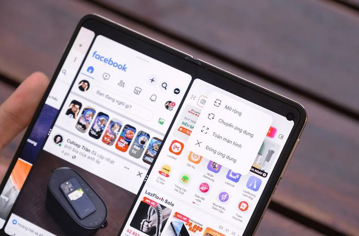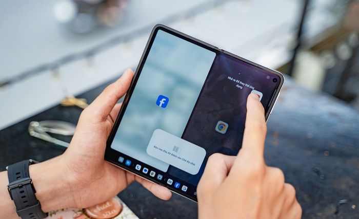 Step 2: To split the screen into 3 sections, users perform a similar action by pressing and dragging the icon of the third app to the lower area of the screen. Once the app is in place, release it to enter Split Mode.
