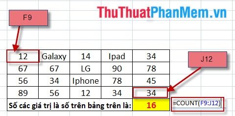 - Using the Count function: Syntax Count (F9:J12).