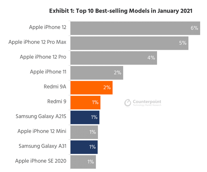 All four variants of the iPhone 12 are dominating the charts as the top-selling phones in the market during the first month of 2021. Despite being in the top 10, the iPhone 12 mini's ranking isn't as high as its counterparts.