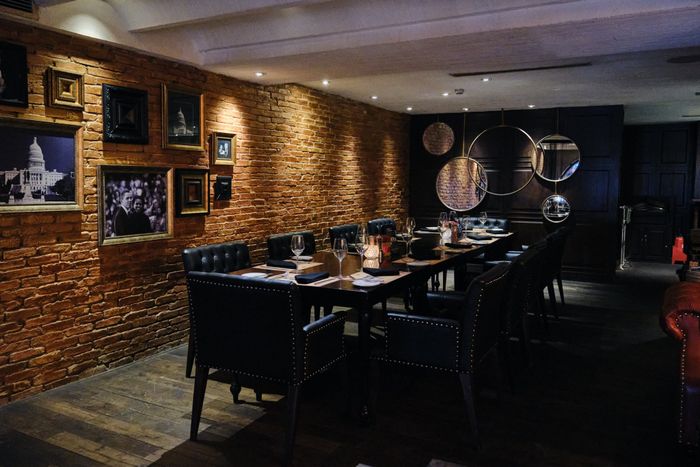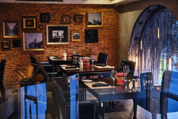 The restaurant's decor features a deep black and brown palette with modern furnishings, while gentle lighting from classic chandeliers adds a romantic and cozy feel. Every element, from the walls to the furniture style, from decorative items to the spatial arrangement, exudes a classic, luxurious European restaurant vibe, showcasing meticulous attention to detail.