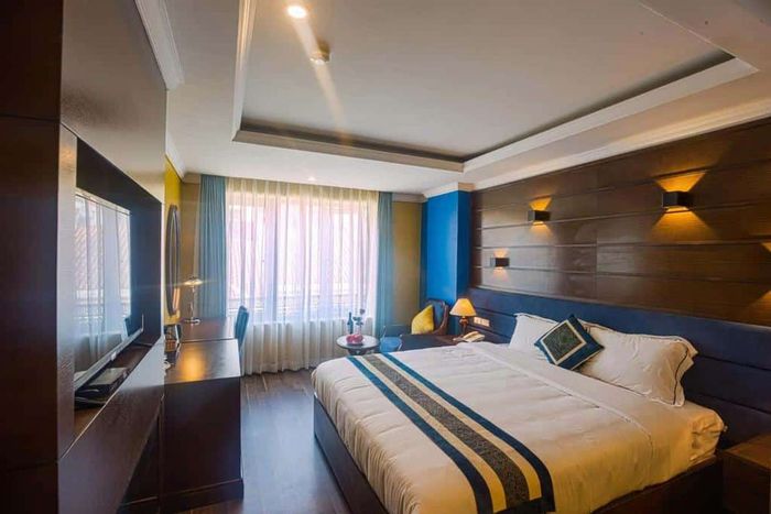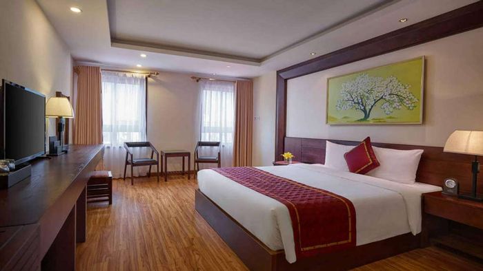 The hotel offers various room types from Standard to Deluxe, meeting the diverse needs of customers. With luxurious architecture combined with wooden furniture decorated in harmonious colors, each room will provide you with a different dimension of tranquility and warmth, dispelling the cold atmosphere. From the balcony of each room, you can also admire the bustling town scenery right in front of you, with the majestic Ham Rong Mountain in the distance.
