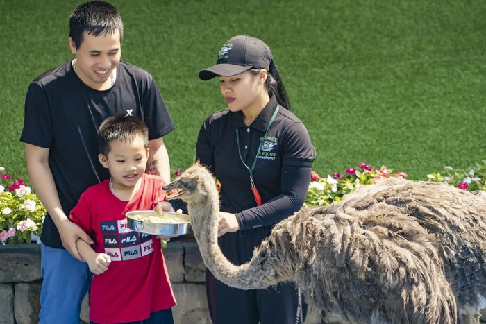 The show presents a diverse and spectacular range of performances within the tropical garden-themed space of the Hoa Dang Theater. Grey parrots gracefully spread their wings; Harris's Hawks skillfully navigate through hoops; ostriches and Bald Eagles demonstrate their majestic hunting skills under the guidance of trainers...