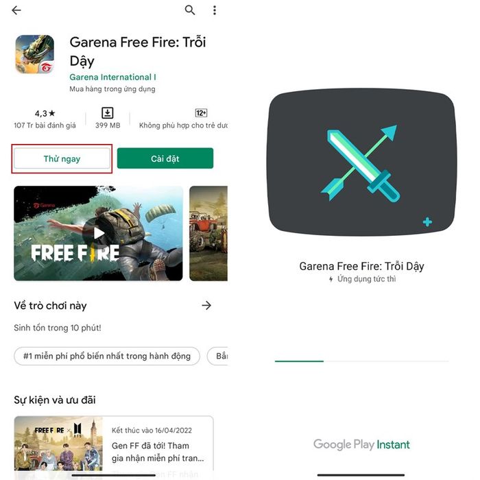 Step 2:From the search results, select Free Fire and click the 'Try Now' button. Garena Free Fire will run instantly after Google Play Instant finishes installing.