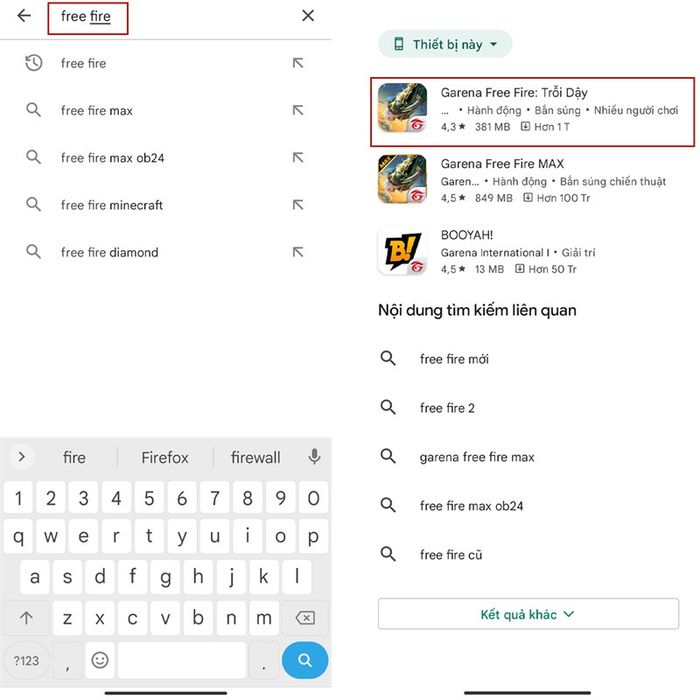 Step 1:Head to Google Play (CH Play) on Android devices. In the search bar, type 'Garena Free Fire' to begin your search.