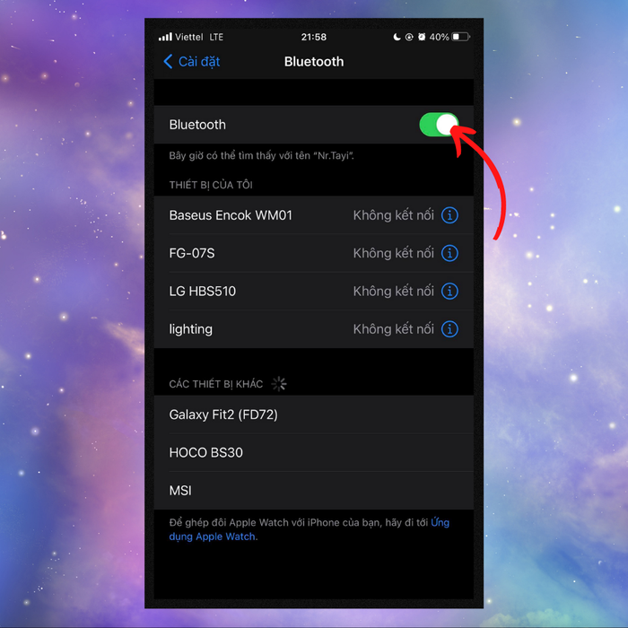 Step 2: Swipe right to turn on Bluetooth. A list of devices will appear.