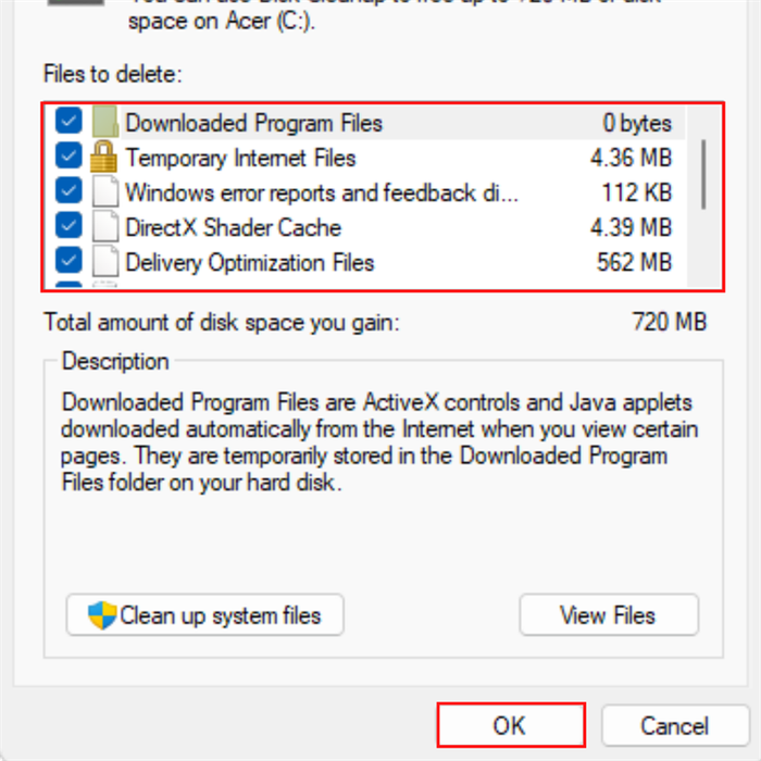 Step 3: Check the files you want to delete and click OK.
