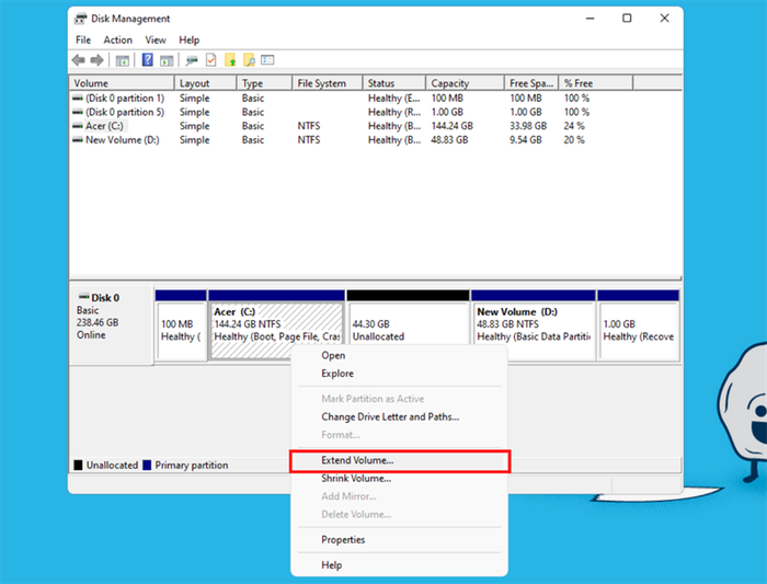 Step 5: Right-click on the C drive partition and select Extend Volume.