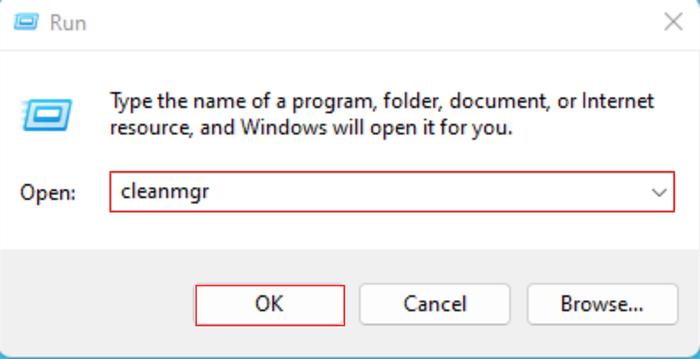 Step 1: On your laptop or desktop screen, press the Windows + R key combination. Then type in the command line cleanmgr and click OK.