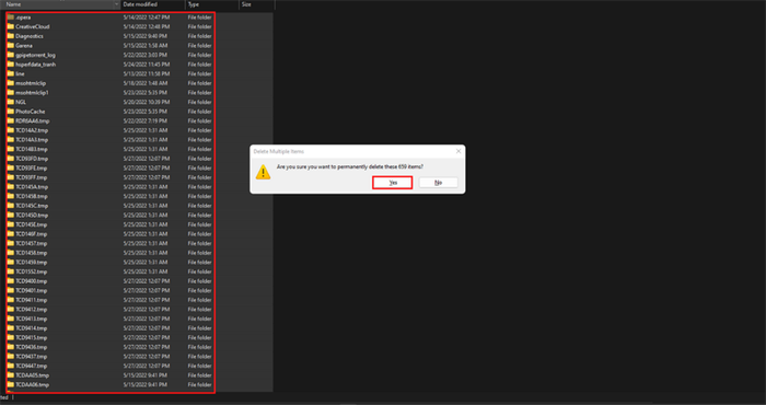 Step 2: You'll be taken to a folder containing these excess files. Here, press the Ctrl + A key combination to select all of these files. Then press the Shift + Del key combination to issue the delete command. Finally, click the Yes button.