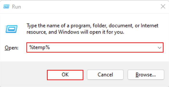 Step 1: On your laptop or desktop screen, press the Windows + R key combination. Then type in the command line %temp% and click the OK button.