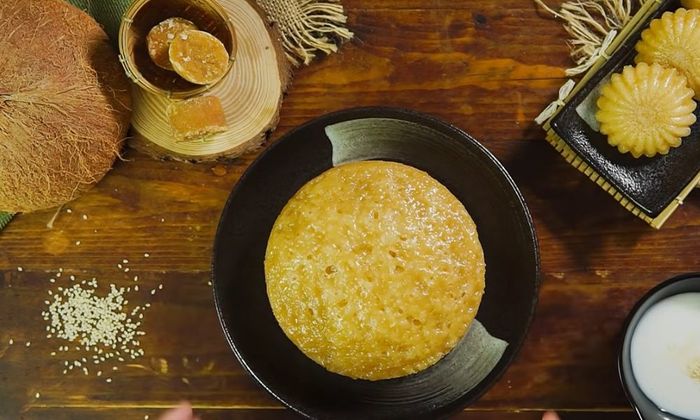 The cake boasts a golden hue when steamed to perfection, captivating every gaze. Furthermore, you can enhance its flavor by drizzling coconut milk and sprinkling some toasted sesame seeds, doubling the delicious taste of this cake.