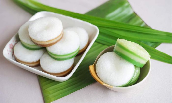 Piggy Skin Cake presents a unique blend of three layers of different colors. The green pandan layer, yellow from mung beans, and the cake layer made from rice flour create a sweet, fragrant, and delicious taste when enjoyed.