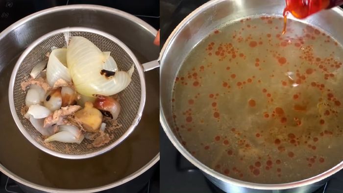 After preparing the broth, remove the onions and ginger, strain out the impurities, leaving the lemongrass in the pot. Adjust the seasoning with a pinch of broth cubes and rock sugar, stirring well. Continue simmering until the broth boils vigorously. Taste and adjust the seasoning again to your liking. As you are about to turn off the heat, add a teaspoon of sesame oil and stir well.