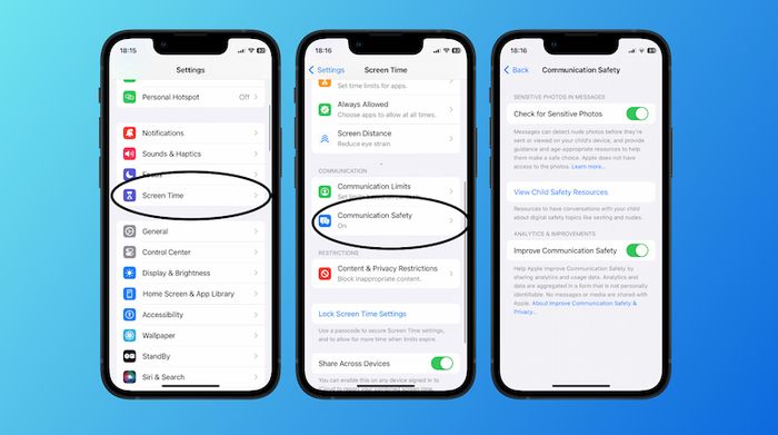 To activate this feature on your iPhone, follow these steps: Open Settings => Select Screen Time => Choose Communication Safety => Enable Check for Sensitive Photos.