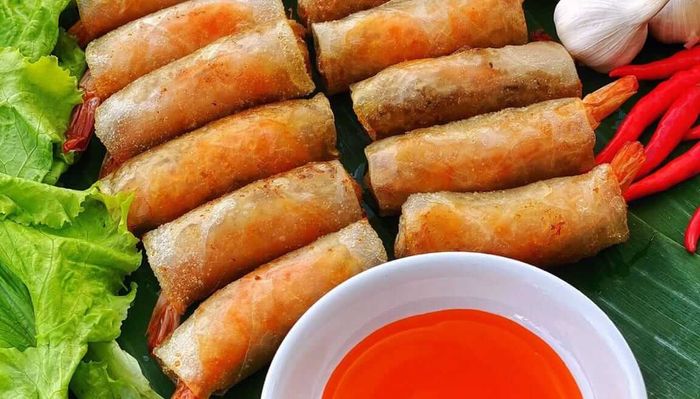 The dish of crunchy land shrimp sausage is one of the favorites enjoyed by many. The prominent filling features two main ingredients: land shrimp and minced meat, wrapped in a layer of rice paper specifically used to roll Binh Dinh-style crunchy sausage. This dish carries a rich and delightful flavor.