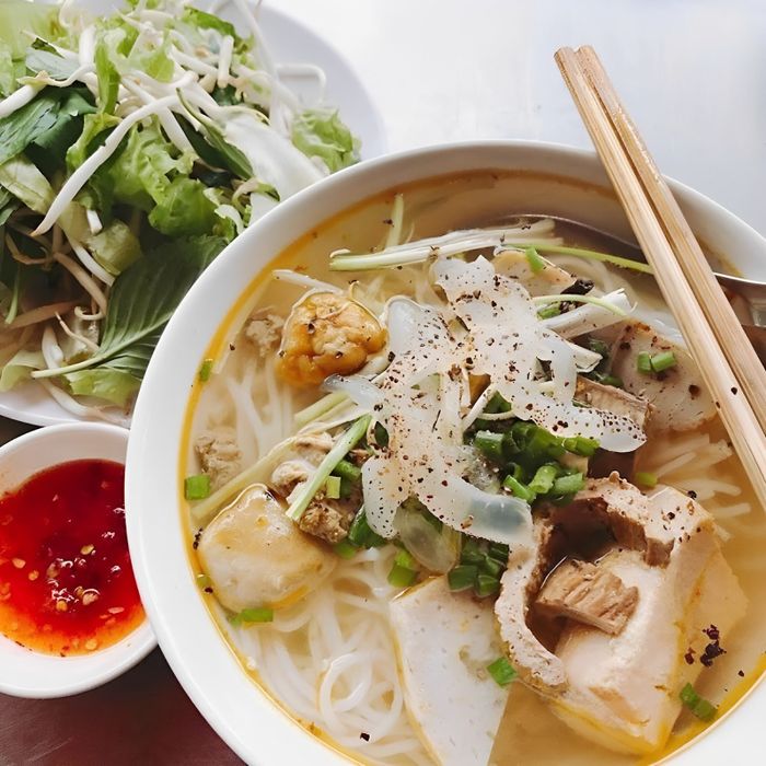 Banh canh, a familiar dish to Vietnamese, becomes a must-try when visiting the beautiful central land of Quy Nhon. Don't miss the chance to savor the delicious pork skin noodle soup with the distinctive flavors of the coastal region.