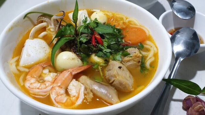 The way bánh canh chả cá is cooked at Mrs. Tư's place in Vũng Tàu is considered the most authentic because the restaurant has been around for a long time. A bowl of mixed bánh canh, besides fish cakes, also includes pork knuckles, fish cakes, shrimp, quail eggs,.. plentiful and enough to make travelers super full!