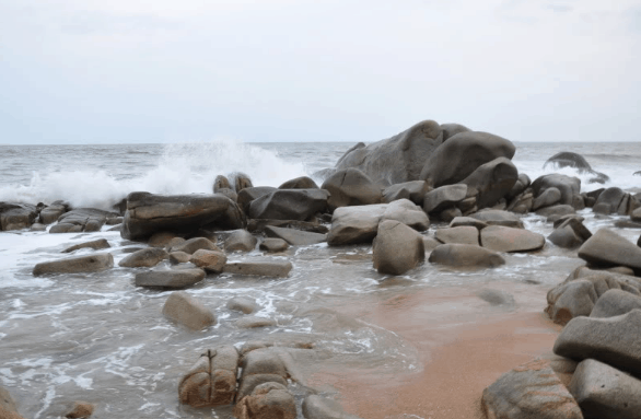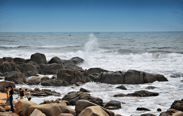 Embrace Playfulness at the Spacious Beach with Gentle Slopes and Picturesque Rock Formations protruding from the Sea. Marvel at the Deep Blue Waters in the Distance and the Constantly crashing Waves creating White Foam along the Shoreline, while Fishing Boats sway in the Sea.