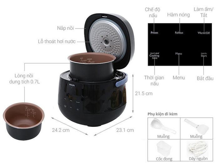The Philips HD3060 boasts a modern, elegant, and compact design. With a capacity of 0.7 liters, it's suitable for 1-2 users, students, and newlyweds. Featuring a modern electronic control panel, it's easy to use, responsive, and intuitive. The HD3060 offers a 24-hour timer function, ideal for those with busy schedules and limited time for cooking.