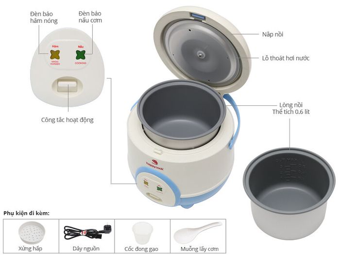The Happycook HC-60 features a round, cute design that is incredibly charming. The compact button control panel with 2 adorable mode indicator lights brings a youthful and lovely design. In addition to cooking rice, Happycook HC-60 can also be used to cook sticky rice, make cakes, or prepare porridge… With a capacity of 0.6 liters, the Happycook HC-60 provides enough rice for 1 – 2 people.