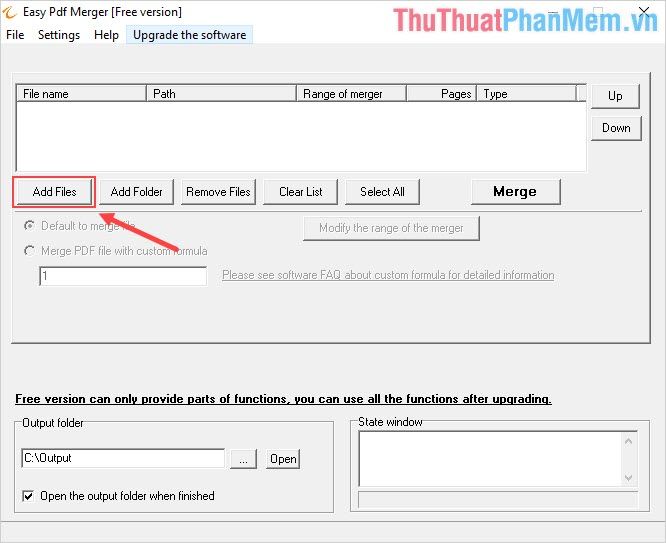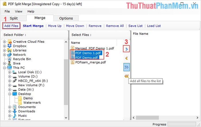 Step 2: Then, choose Add Files (1) to add the PDF files you want to merge into the system. To add files, select File PDF (2) and press the Arrow (3) key to add them to the system.