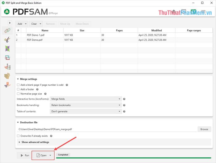 Additionally, you can set the output of the PDF file after merging at Output.
