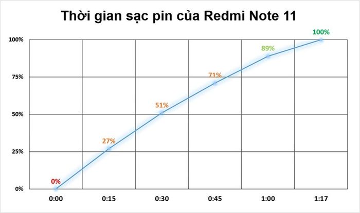 Statistical breakdown of the charging time for the Xiaomi Redmi Note 11.Moreover, you'll enjoy even more freedom with the Redmi Note 11's 33W fast charging, allowing you to quickly recharge your battery and save more time.