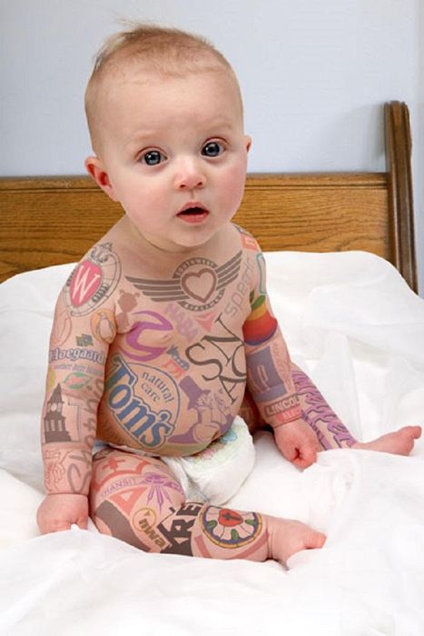 Upon hearing about this tattoo style, many will surely be startled and skeptical, as it is believed to be quite painful, especially for young children with delicate skin. However, this is the unique creation of Dietrich Wegner, named Cumulous Brand. The artist refrains from tattooing the bodies of children, opting instead to use safe drawing colors to craft distinctive artworks featuring the names or logos of various companies, turning the children into advertising models for their products.