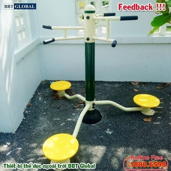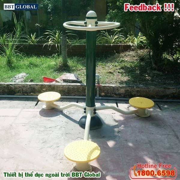 The core rotator equipment is designed with a central column and three rotating platforms that can securely attach to the ground. The column features a sturdy handle design, and the specially designed rotating platforms prevent slipping, ensuring safety for users. The outdoor fitness machine provides three standing positions for three people to exercise simultaneously, making it a social and engaging workout experience.