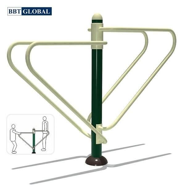 The outdoor dual arm press is designed with a sturdy main column, two hand press devices, and two solid seats. Its dual-machine design allows two individuals to work out simultaneously, targeting leg muscles, arm muscles, and shoulders. This equipment also enhances flexibility in arm joints and shoulders during the exercise routine.