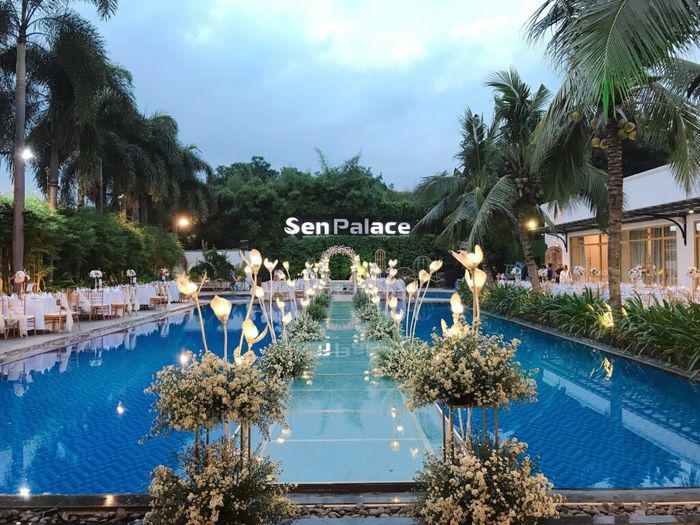 Sen Palace is a Binh Duong wedding venue with both indoor and outdoor spaces. The outdoor wedding hall is set next to the swimming pool with a spacious, dazzlingly lit garden. Tables and wedding halls are adorned with abundant flowers, creating a magnificent wedding atmosphere. In addition to the outdoor area, Sen also features a spacious indoor wedding hall!