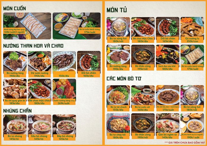 Veal is the staple of the menu, offering a rich variety of dishes categorized into appetizers, stir-fries, hot pots, grills, countryside specialties, and Hanoi delicacies.
