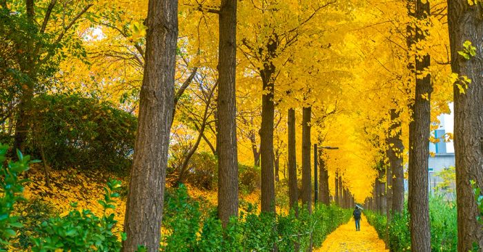 If you're often in search of romantic autumn photos, you've probably seen the Asan Gingko Tree Road somewhere. The two rows of trees along the road intertwine with vibrant yellow leaves, creating a canopy of golden foliage that makes this road a popular 'Instagrammable' spot every fall.