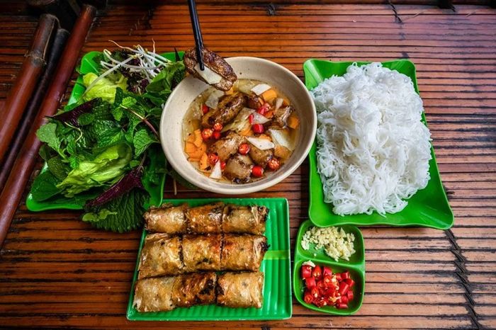The finished product of Hanoi's Bun Cha is presented on a small bamboo tray, featuring finely cut vermicelli, pickled vegetables made from carrots and turnips, pork patties soaked in the well-seasoned Hanoi dipping sauce, and a variety of fresh herbs. Some places may also include crispy spring rolls (nem ran) for added allure. When enjoying Hanoi's Bun Cha, diners simply mix a bit of vermicelli into the sweet and tangy dipping sauce, creating a flavorful combination with the rich pork patties that is both aromatic and unforgettable.