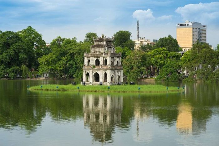 Hoan Kiem Lake, also known as Sword Lake, is a freshwater lake inseparable from the capital Hanoi. Mention Hanoi, and Sword Lake immediately comes to mind. The name Hoan Kiem is linked to the legend of King Le Thai To returning the magical sword to the lake's mythical turtle. This natural freshwater lake is strategically located at the intersection of Hang Dao Street, Hang Ngang Street, and Luong Van Can Street. Covering an area of about 12 hectares, the lake has a depth of approximately 1-1.4 meters. The lake is notable for the Turtle Island in its center and the age-old Turtle Tower reflecting on its surface.