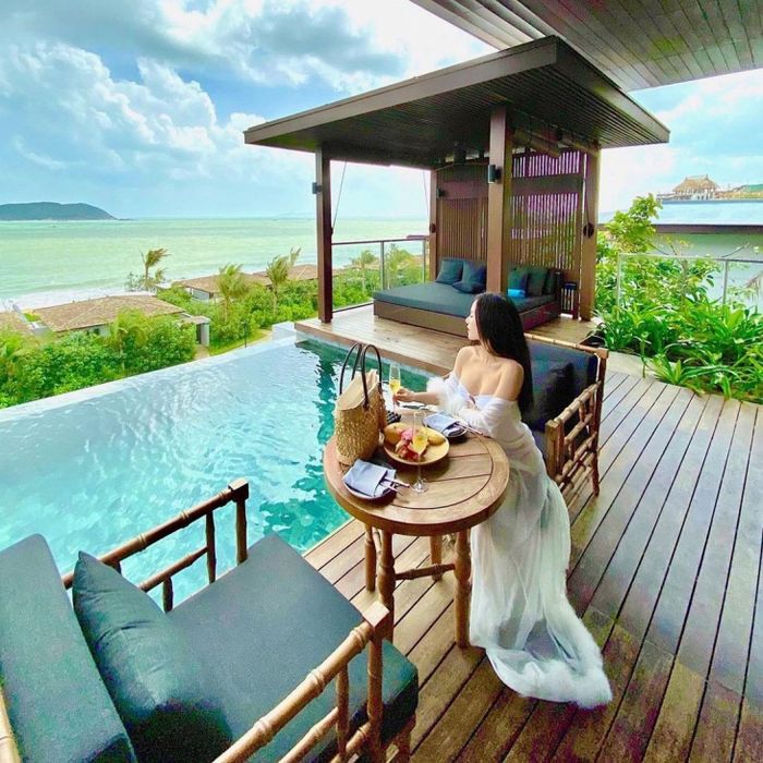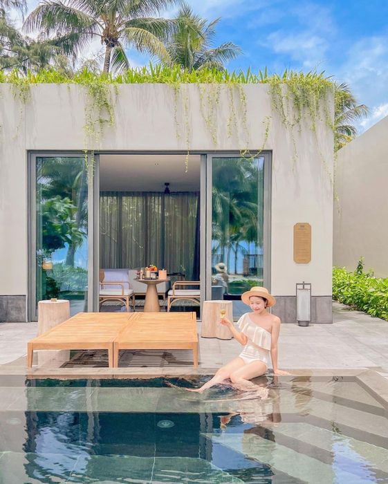 The distinctive feature of this luxury resort is its environmental friendliness. All construction materials are sourced from natural origins. The harmonious space with nature unfolds a breathtaking scenery: lush greenery behind and an endless stretch of white sandy beach in front. It's like a masterpiece painted by a renowned artist. Each villa, with a simple yet elegant design, is equipped with full 5-star amenities. Prices for these villas range from 5 to 160 million VND per night. Moreover, each villa comes with a private pool, outdoor sunbathing area, providing guests with an exceptional sense of enjoyment.