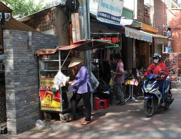 Their first stop was a banh mi cart nestled in an alley on Truong Dinh Street, between Ngô Thời Nhiệm and Nguyễn Đình Chiểu Streets. The proprietor of this banh mi cart is Ms. Hoàng Thanh Mai, a newcomer to the trade of selling banh mi thit for only about two to three years. Andrea Nguyen wrote in her 'Banh Mi Handbook': 'When Ms. Mai's banh mi cart commences a day of vending, and when one observes eggs being cooked on the charcoal stove... my 'banh mi radar' springs into action.' On that cart, alongside banh mi thit, there is also banh mi op la, but what distinguishes Ms. Mai's banh mi cart, according to Andrea Nguyen, is the steamed pork loaf. Bearing resemblance to the renowned Italian mortadella sausage, the steamed pork loaf is one of the trio of meats comprising Ms. Mai's 'special' banh mi: Chinese sausage, grilled meat, and steamed pork loaf. All stuffed into the bread along with pate and, naturally, indispensable condiments like mayonnaise, pickles, soy sauce, onions... And to preserve quality, hot crispy bread fresh out of the oven is regularly brought to Ms. Mai's banh mi cart every few hours during the three to four-hour selling window, sufficient for her to vend about a hundred loaves a day.