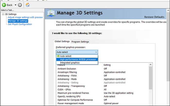 Step 5: Choose High-performance NVIDIA processor from the list.