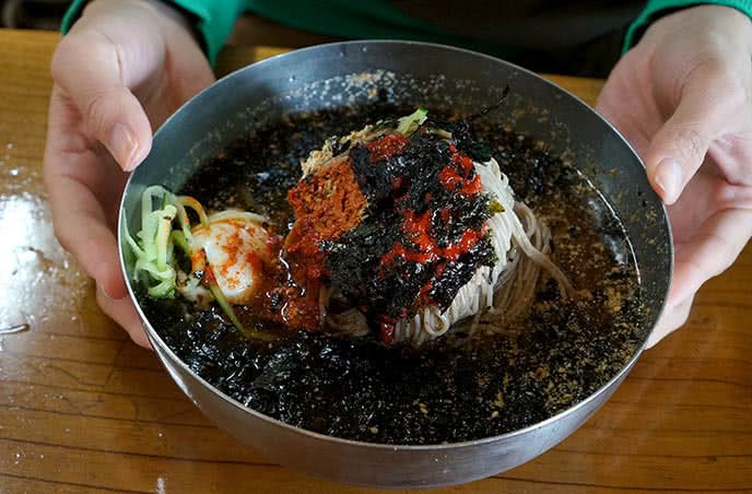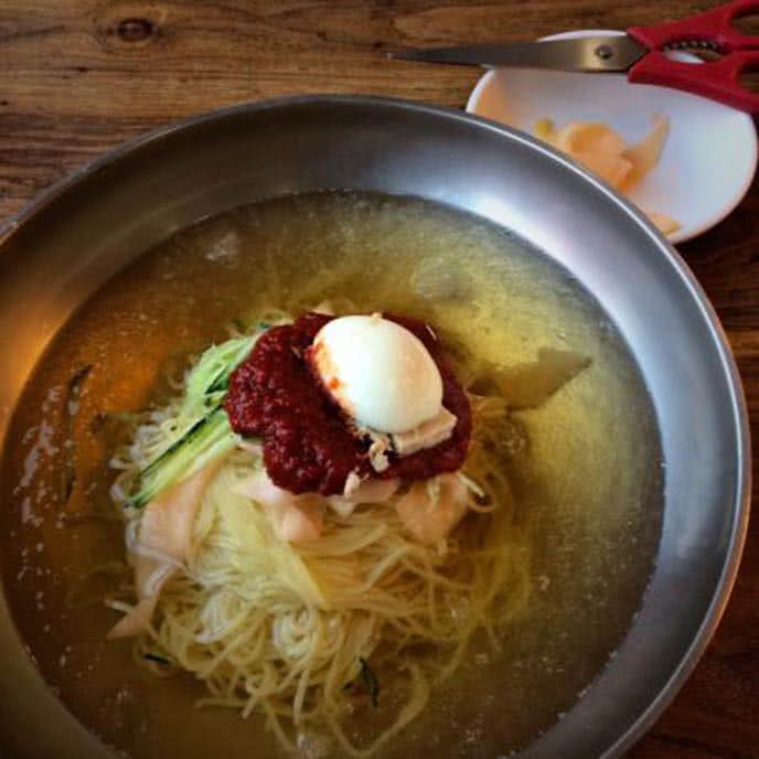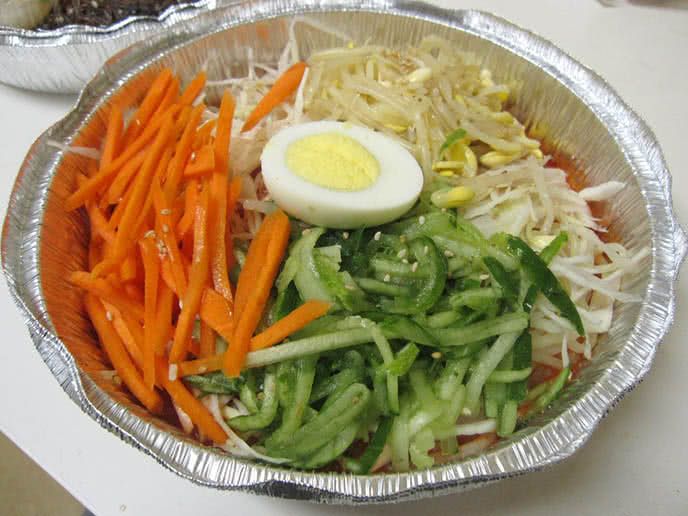 Yet another type of chilled noodles served bibim-style - meaning mixed with various colorful and enticing ingredients, and without accompanying broth. The noodles are very chewy, the sauce is sweet, usually served with boiled eggs, bean sprouts, and finely chopped cucumbers.