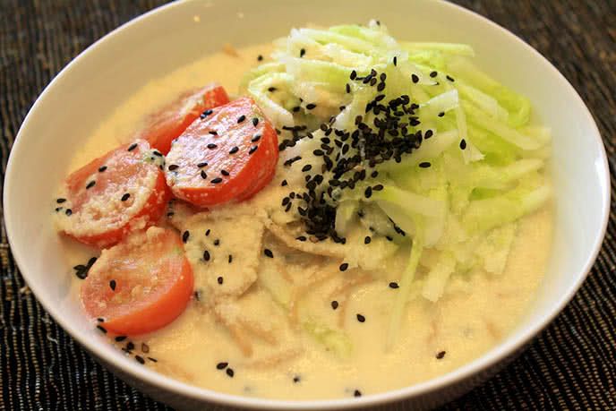 Those familiar with Korean will recognize that the name of this noodle dish reflects the characteristics of its accompanying broth. The broth is made entirely from finely ground soybeans and salt. It is a light, refreshing vegetarian dish with a perfect natural flavor for summer. The noodles are often enjoyed with pickled radish kimchi or cucumbers. Sometimes, even the broth is chilled and sprinkled with a little sesame seeds for an appealing presentation.