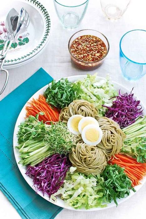 Jeangban, meaning 'big tray,' and guksu, meaning 'noodles,' perfectly describe this dish. True to its name, jeangban is a large platter filled with assorted vegetables and noodles arranged around the edges. This unique presentation earns jeangban the nickname 'noodle hotpot.' The variety of vegetables used in jeangban ensures a burst of flavors: sour, sweet, bitter, spicy... keeping this vegetarian dish always exciting. Additionally, the rich sauce made from sesame oil, chili, sugar, and vinegar infused in every noodle balances the flavors of this gigantic 'vegetarian noodle hotpot,' transforming jeangban from a simple vegetable dish to a captivating and delightful feast.